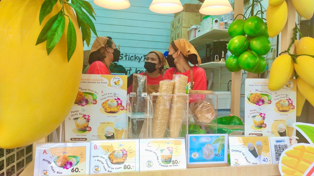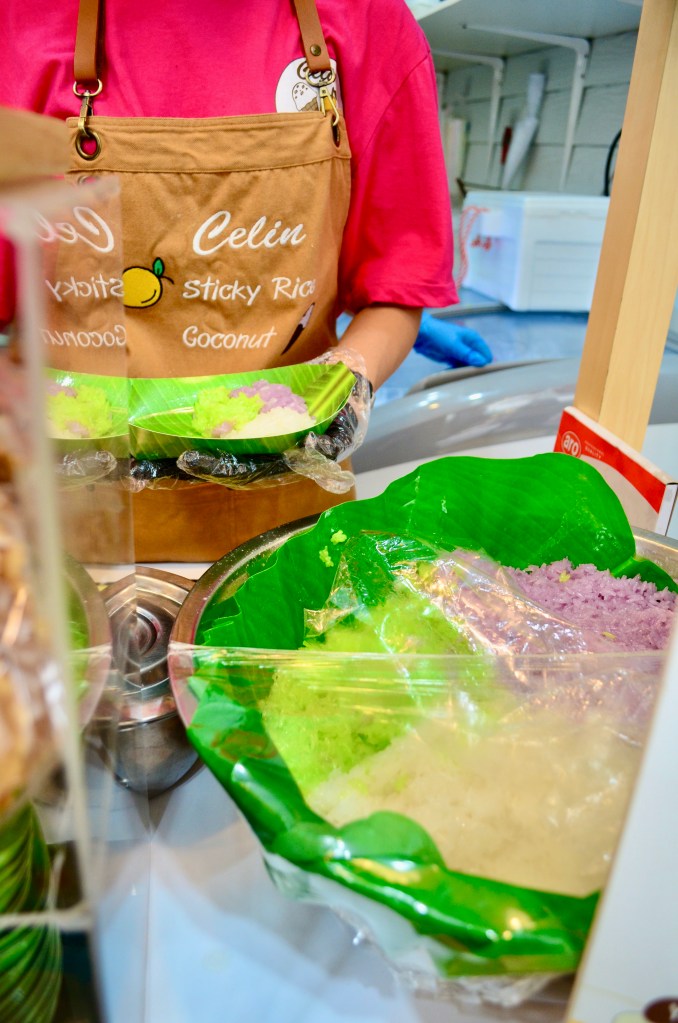 In the middle of chaos and clamor, and sweltering heat of the afternoon sun, I was tempted at the sight of fresh coconut juices and flavored cold beverages piled together. It was a delight to watch people, indulging in their scoops of coconut ice cream and a bowl of mango sticky rice. We partook and joined in on the fun too.