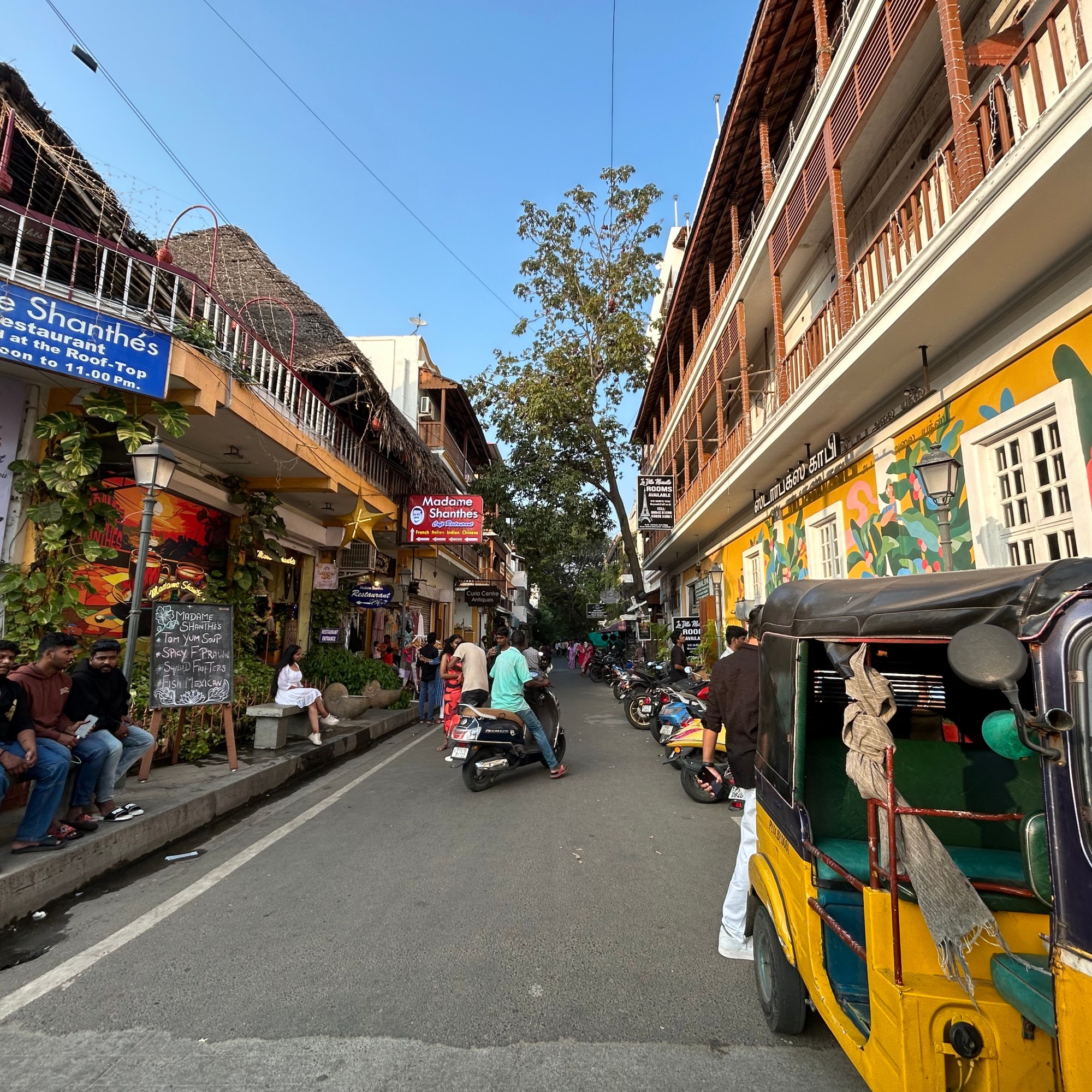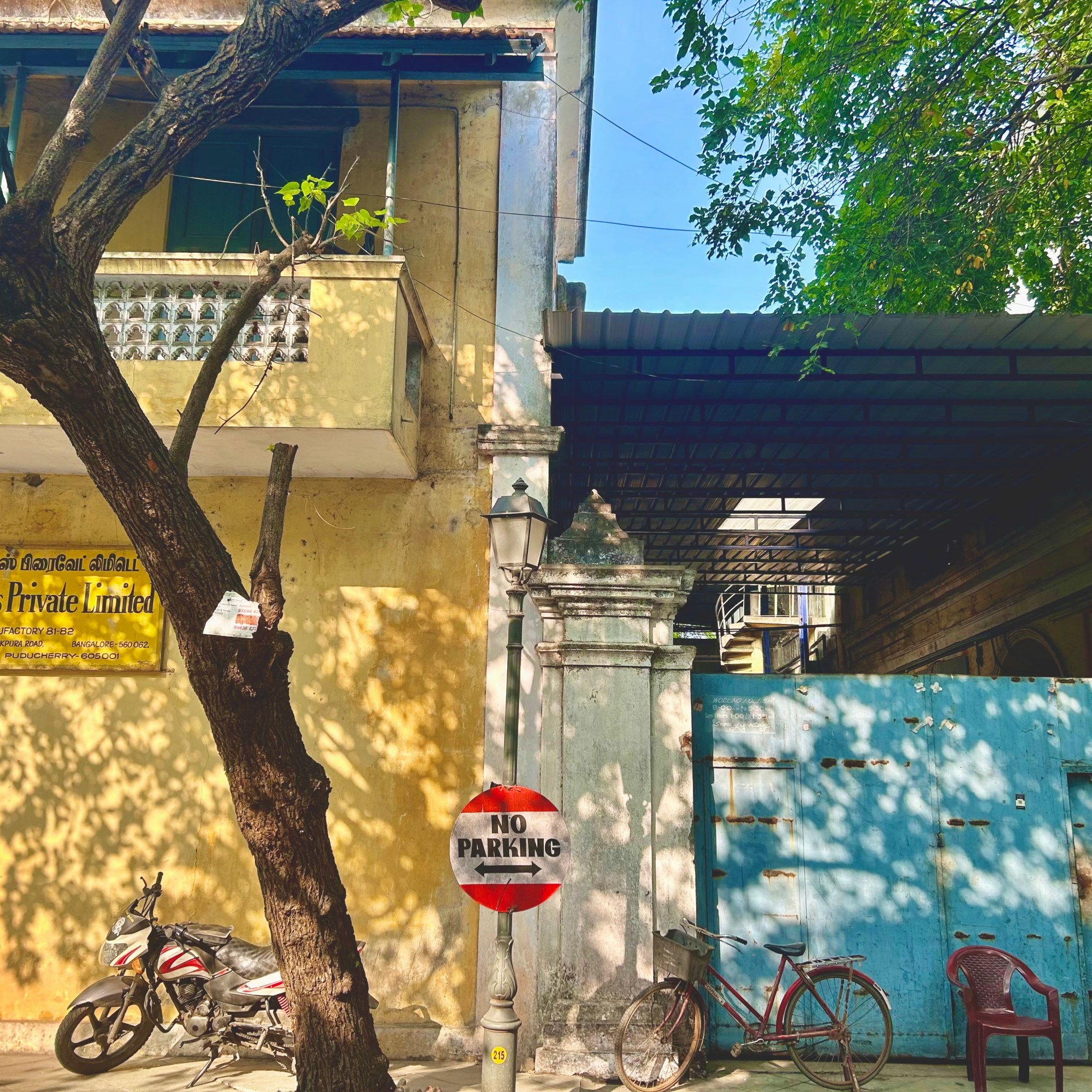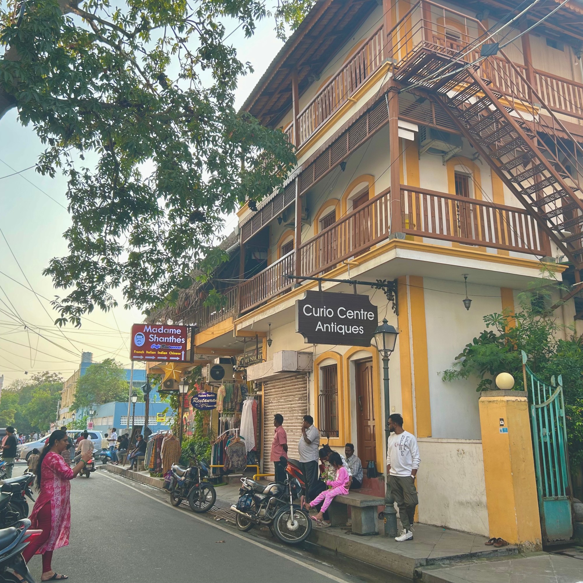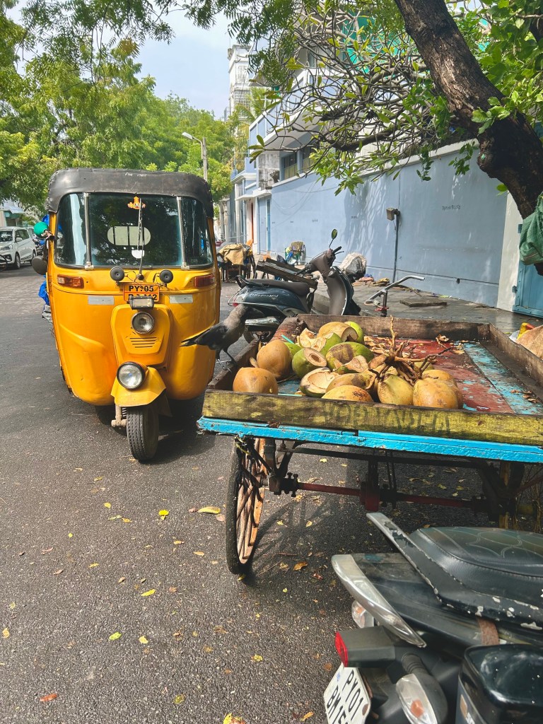 Every day, we would saunter down to explore the streets lined with bougainvillea and palm trees, art galleries and boutiques. Occasionally, I would stop to admire the ornate gates, stately doors, arched windows, wooden columns, colonnades, cornices, and courtyards. These features, characteristic of Franco-Tamil architecture––a blend of French and vernacular styles––can be seen in the administrative buildings, institutions, and residential homes.