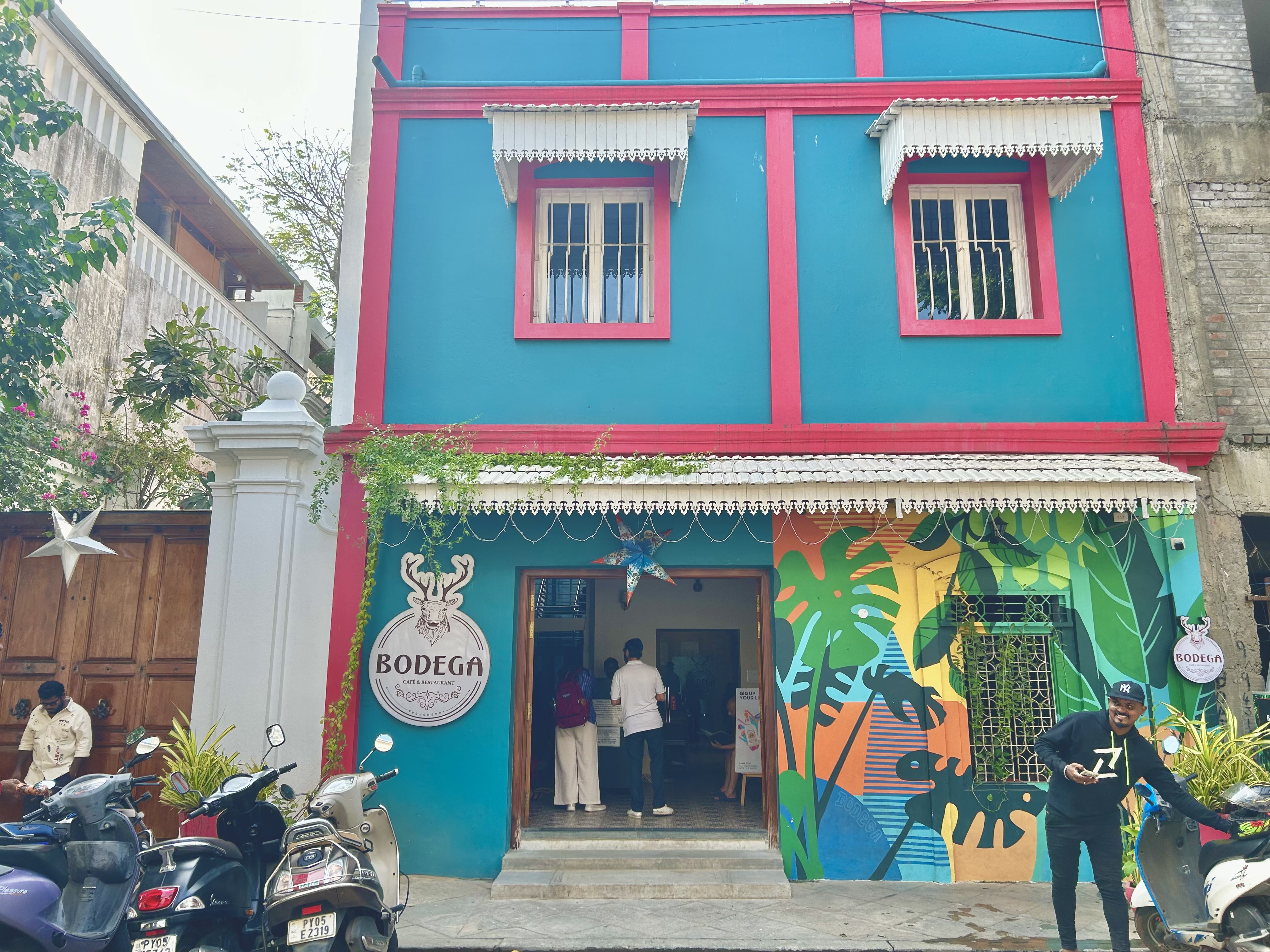 Every day, we would saunter down to explore the streets lined with bougainvillea and palm trees, art galleries and boutiques. Occasionally, I would stop to admire the ornate gates, stately doors, arched windows, wooden columns, colonnades, cornices, and courtyards. These features, characteristic of Franco-Tamil architecture––a blend of French and vernacular styles––can be seen in the administrative buildings, institutions, and residential homes.
