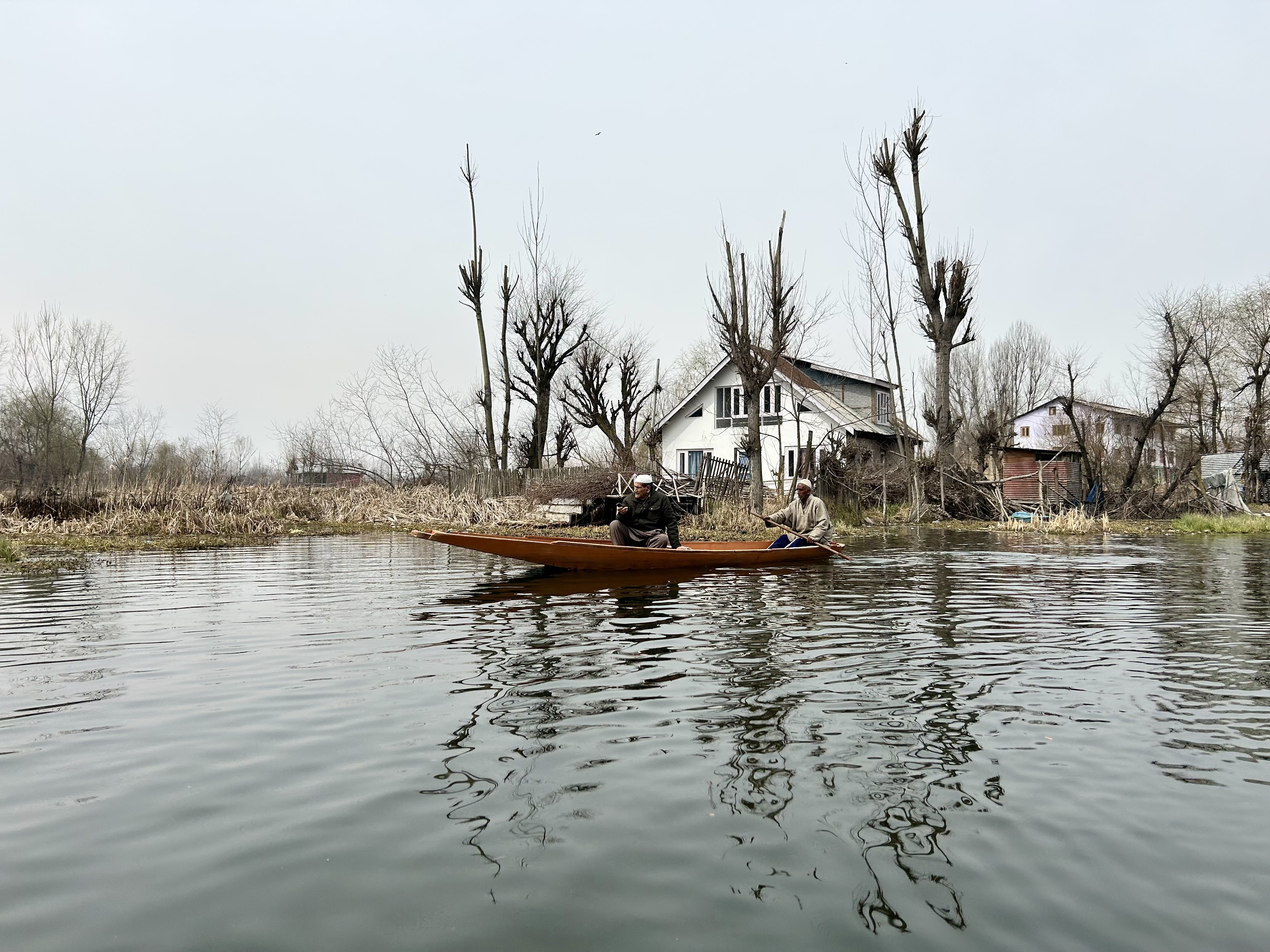 A boatman glides through Dal Lake, ferrying a merchant past stilted homes and winter-bare Chinar and willow trees.
