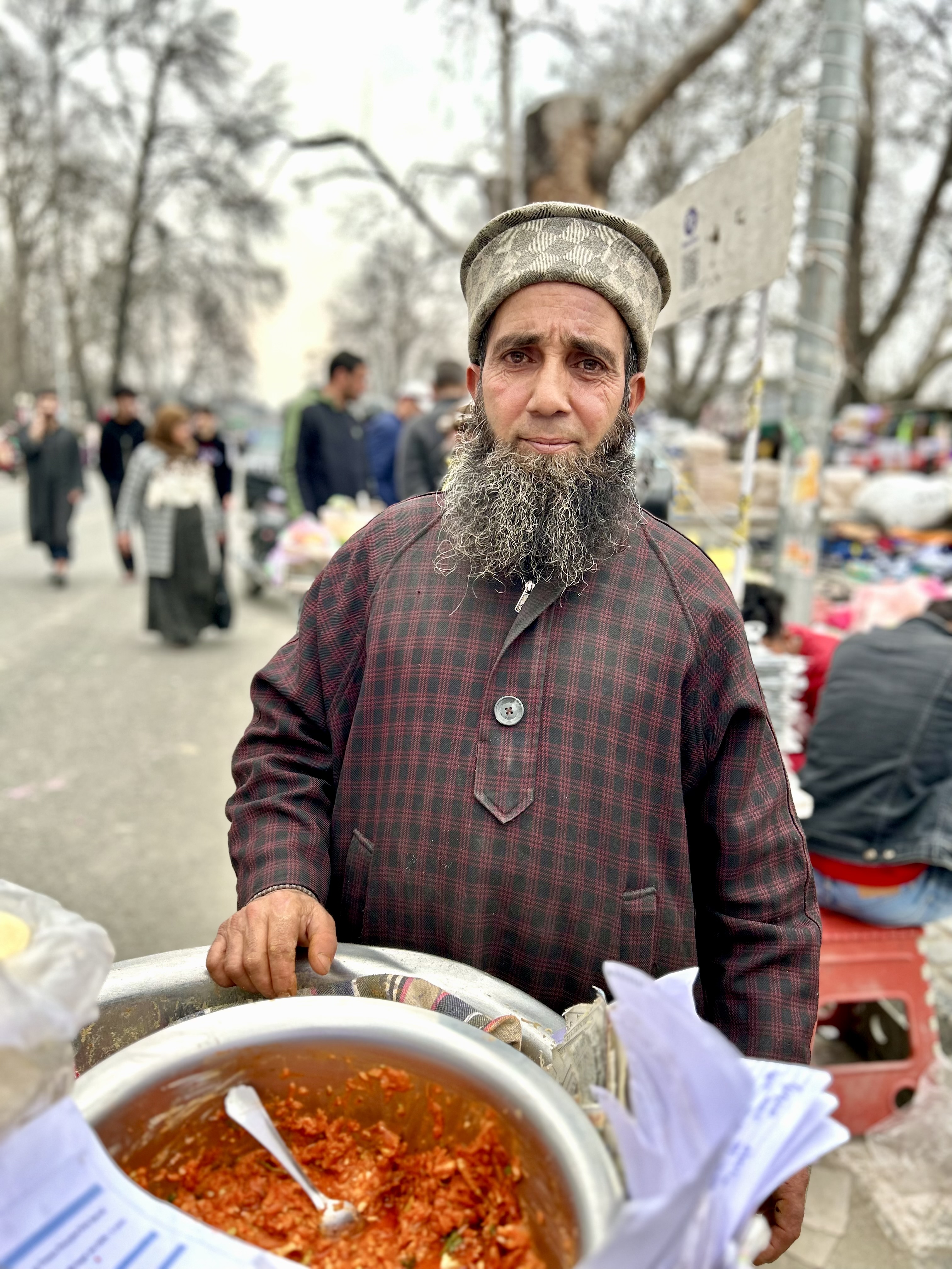 At Srinagar’s bustling Sunday market, a street vendor prepares Masal Tchot—a local snack of flavorful, spices chickpeas wrapped in soft, warm lavasa or flatbread.
