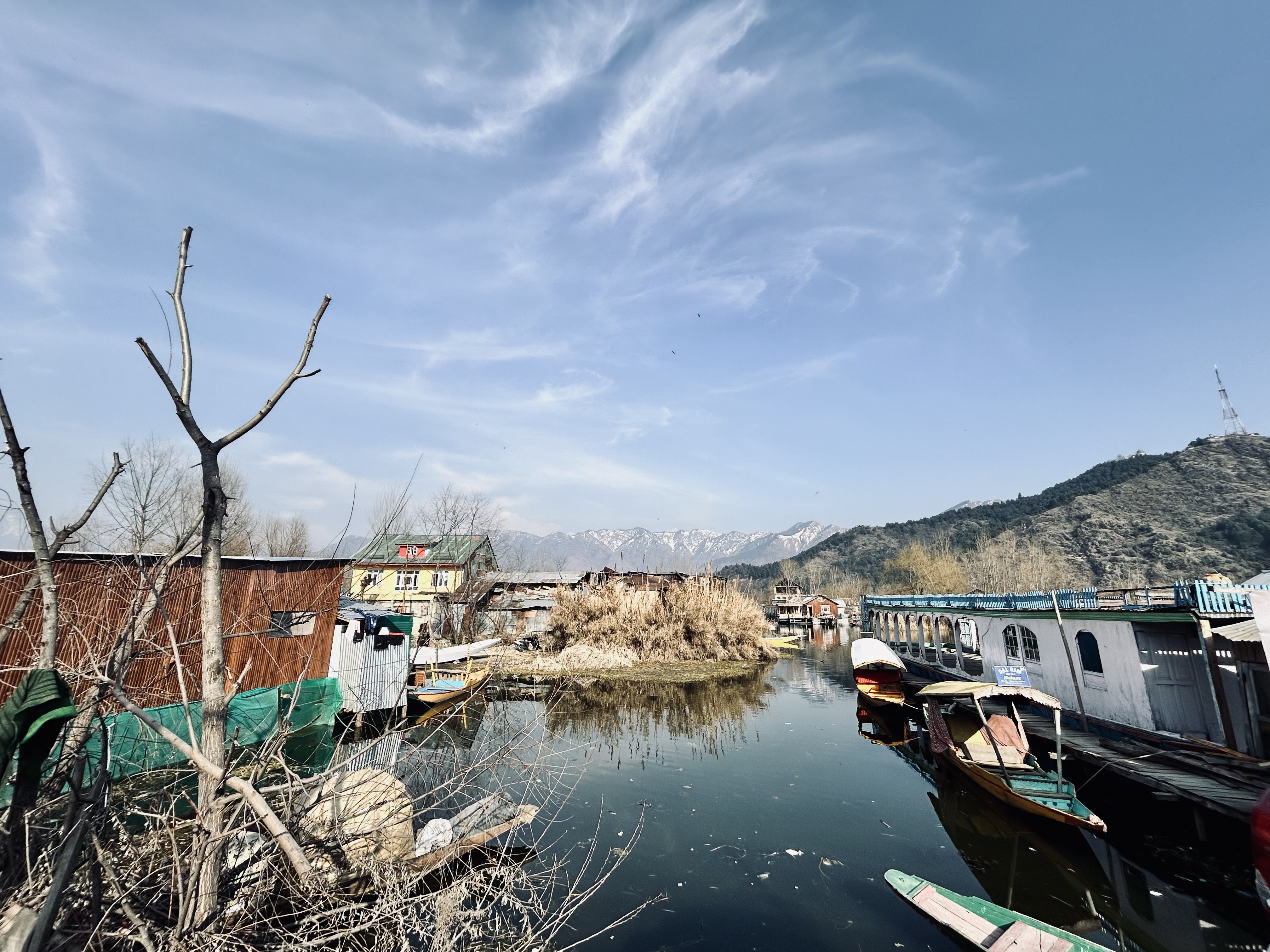 A lesser seen side of Dal Lake. Houseboats and shikaras float among patches of marshland, set against a stunning backdrop of wispy clouds and the distant Zabarwan Range.